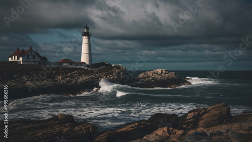 A photo of a lighthouse standing tall and proud amidst a dark, stormy backdrop.
