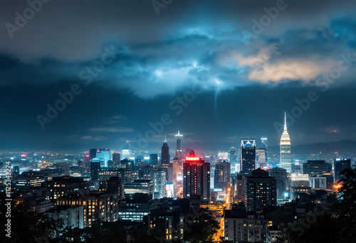 A photo of a night skyline city with bright lights