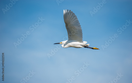 A photo of a Snowy Egret flying by at a florida nature and wildlife preserve, in Tampa.