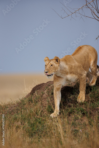 A photo of a subadult Lioness observing from a mud mound in Savannah in Masai Mara Kenya in September 2022