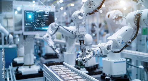 A photo of an advanced technology production line with robotic arms working on electronic components, illustrating the integration and polarization between robotics and global high-tech industrial