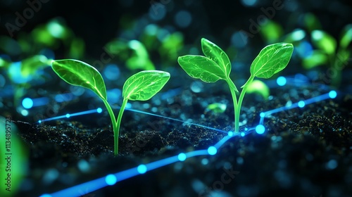 A photo of small plants growing in dark, rich soil. The ground should be crisscrossed with glowing neon-blue lines resembling a digital network or energy grid, with a futuristic technological vibe.