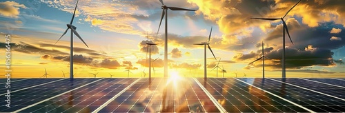 A photo of solar panels and wind turbines against the backdrop of mountains
