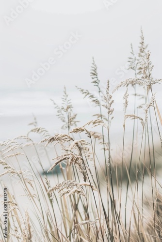 a photo of tall grass in front, the beach is visible on background, pastel colors, muted tones, minimalistic