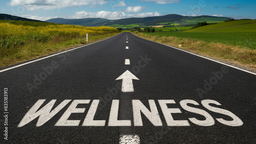 A photo of "Wellness" written on an road, with an arrow pointing toward green fields and hills, symbolizes a health-focused travel journey, blending the road to wellness with natural landscapes.