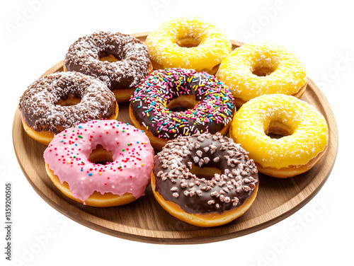 A photograph of a round wooden plate with one donut featuring pink glaze and sprinkles six donuts covered in chocolate On a Transparent Background PNG