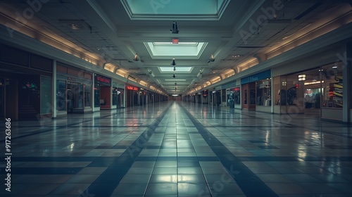 A photograph of an empty shopping mall with deserted corridors and closed shops, dim lighting casting long shadows. The scene is set during a cloudy day, creating a somber and abandoned atmosphere.