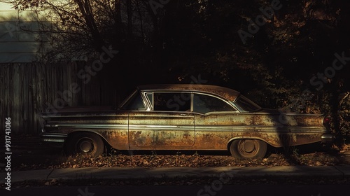 A photograph of an old car parked by the roadside, taken with a film camera, showcasing rich textures and deep shadows.