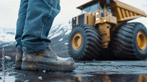 A photograph of the side view of worn work boots standing on wet ground next to a yellow mining truck with huge tires in the background.