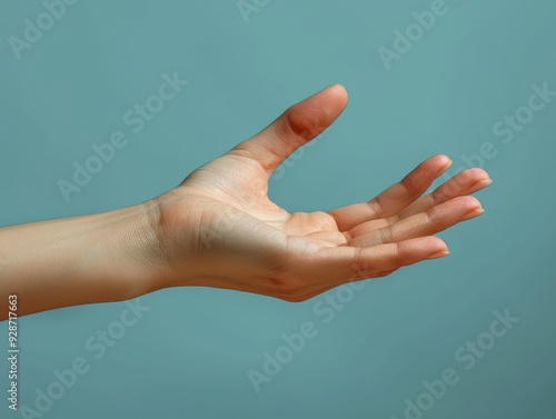 A photograph showcasing an expressive outstretched human hand with fingers slightly curved, set against a solid aqua blue background