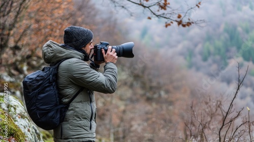 A photographer capturing nature in a mountainous landscape during autumn.