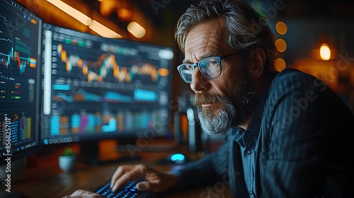 A photographic style of a financial analyst using advanced financial analysis software on a desktop computer, modern office setting, focused expression, multiple data charts on the screen, bright dayl