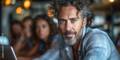 A photography of middle-aged man and his group of friends or his coworker ,blurred background image