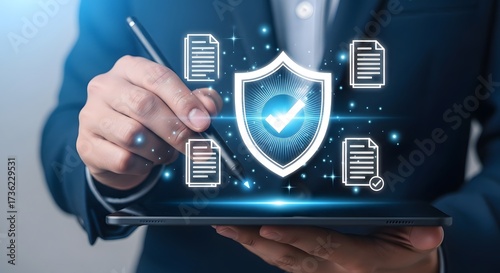 A Photorealistic Close-Up of a Futuristic Digital Interface Displaying a Glowing Shield with Checkmark, Surrounded by Document Icons, Controlled by a Stylus - Security Achieved.