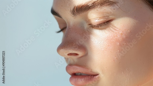 A photorealistic close-up of a woman with a delicate pattern of pink gel paint on her skin.