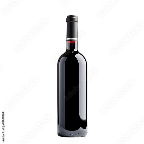 A photorealistic image of a bottle of red wine, elegantly designed with a dark glass body, a minimalist label, and a clean foil seal over the cork