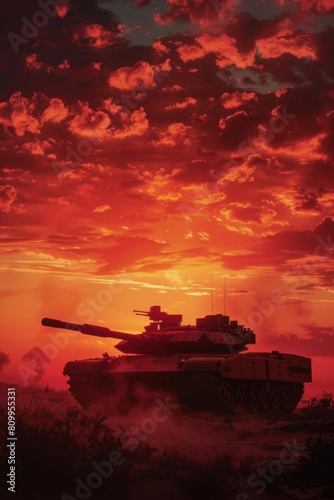 A photorealistic image of an Military tank M1 Abrams silhouetted against a fiery desert sunset