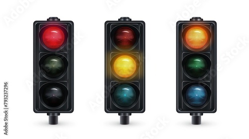 A photo-realistic vector illustration of traffic lights with all three colors lit, isolated on a white background
