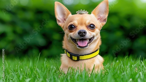 A photostock images of a Chihuahua wearing a small crown while standing in a sun-dappled garden. High Quality Dog Image