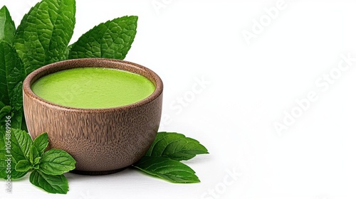 A photostock of a fresh green soup in a bowl on a white background, vibrant and healthy.