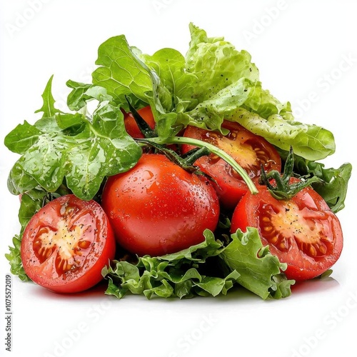 A photostock of a gourmet salad with cherry tomatoes and mixed greens, ideal for healthy eating or lunch themes, isolated on white background, High Quality