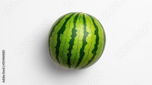 A photostock of a whole ripe watermelon with vibrant green stripes, placed on a seamless white background, symbolizing summer freshness and hydration. High Quality