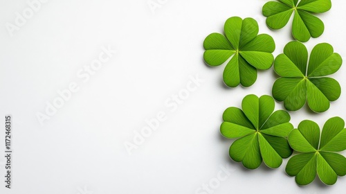 A photostock of fresh green clovers scattered evenly across a clean white surface, symbolizing luck and nature in a vibrant display. High Quality