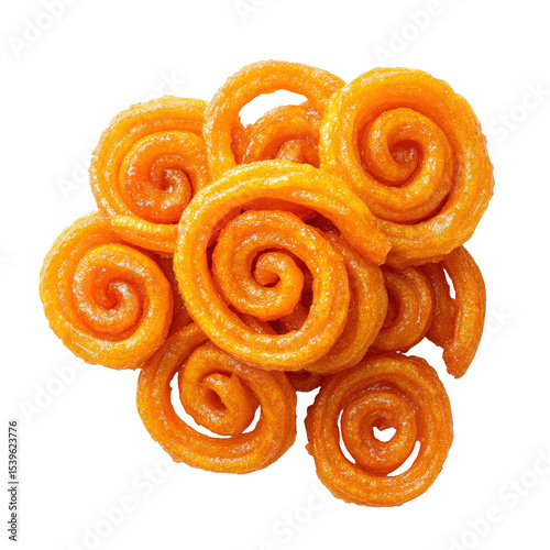 A photostock of spiral orange jalebis arranged on a plate, isolated on a white surface, sweet and festive, High Quality