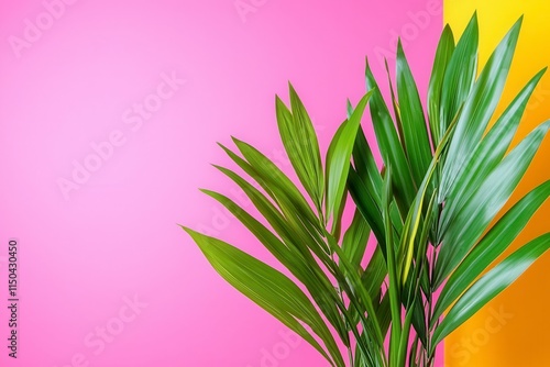 A photostock of tropical palm leaves swaying in the wind against a soft pink and orange sunset sky, symbolizing relaxation and wanderlust. High Quality