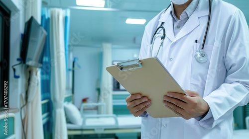 A physician specializing in medical science stands in the ward, writing medical records on a clipboard.