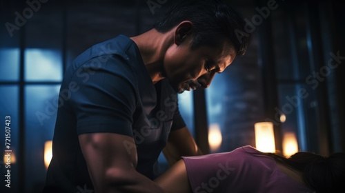 A picture of a man and a woman in a dimly lit room. This image can be used to depict a romantic or intimate setting