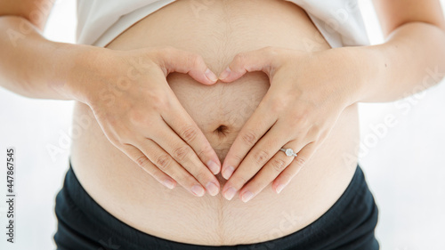 a picture of beautiful hands with a nice fair skin making a gesture of heart shape on pregnancy's belly over white background. Healthy and happy mother concept