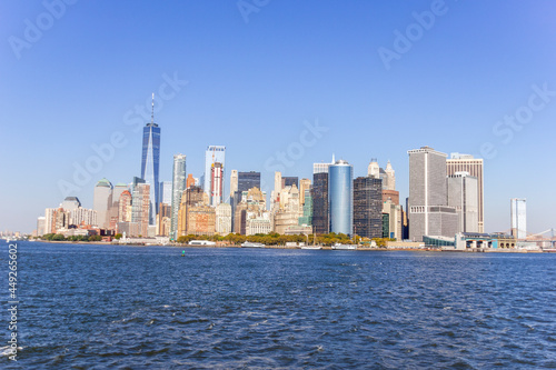 A picture of Manhattan skyline with Battery Park and Maritime terminals, bridges and Brooklyn, NY, USA