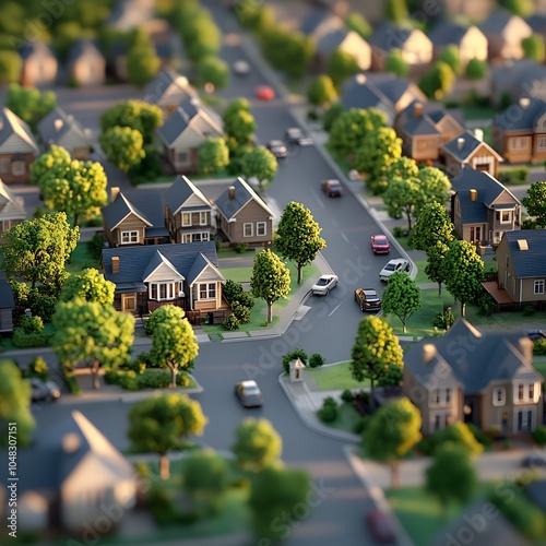 A picturesque 3D render of a well organized suburban neighborhood featuring rows of neatly designed houses tree lined streets and parked cars in front of each residence