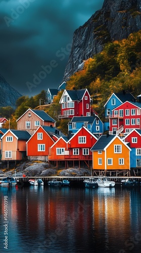 A picturesque and serene village nestled along the shores of a tranquil Norwegian fjord with brightly colored traditional wooden houses mirrored in the still glassy waters