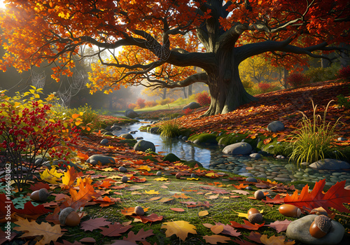 A picturesque autumn meadow with a stream and an old tree surrounded by bright leaves.