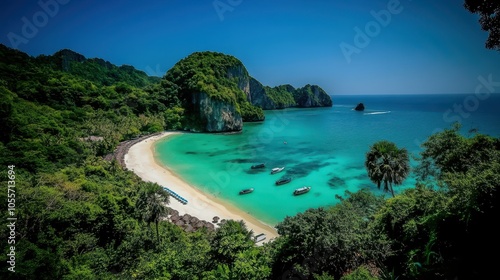A picturesque bay with turquoise water, surrounded by lush green cliffs and coconut palms, white sandy beach below and a cloudless sky above.