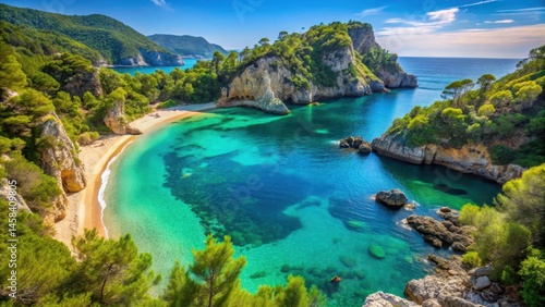 A picturesque bay with turquoise waters and a small cove surrounded by lush greenery and towering cliffs , landscape, beach