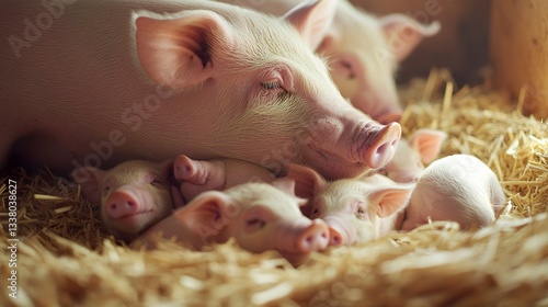 A picturesque farm scene of piglets suckling from their mother, the soft texture of straw bedding complementing their pink skin, capturing the essence of new life