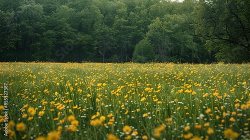 A picturesque field featuring an array of yellow flowers dotting the lush green grass, with a spring park in the background showing subtle patches of melting snow; the scene transitions into a forest