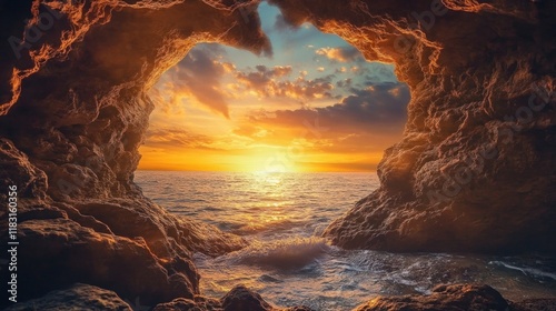 A picturesque heart-shaped cave opening overlooking the ocean, bathed in the golden light of sunset, offering a peaceful and romantic scene