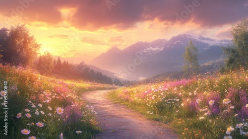 A picturesque landscape at sunset, featuring a winding path through vibrant wildflowers, mountains in the background, and a dramatic sky.