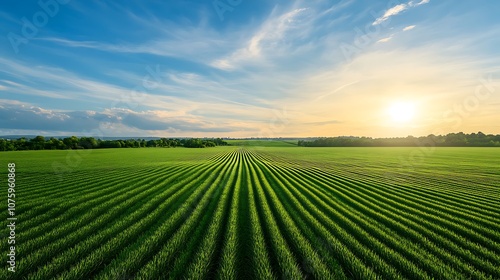 A picturesque landscape featuring lush green fields stretching towards a clear blue sky, illuminated by the warm glow of the rising sun.