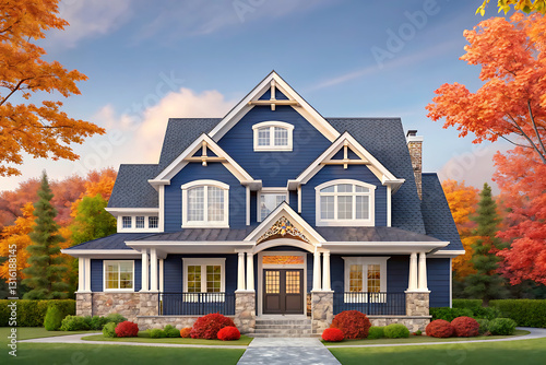 A picturesque, large home with a deep navy blue exterior, accented by white trim and stonework. house, home, building, architecture, residential, estate, brick, new, door, exterior, cottage, sky, real