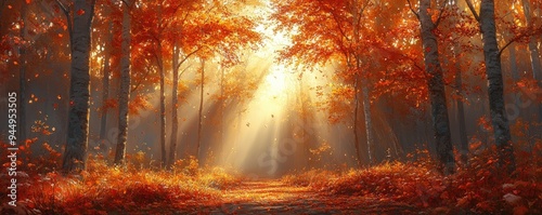 A picturesque pathway through an autumn forest, bathed in golden sunlight.