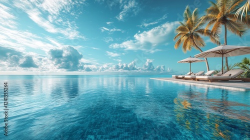 A picturesque pool area with sun loungers and umbrellas, encircled by palm trees, providing a peaceful sea view for ultimate relaxation.