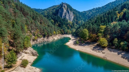 A picturesque river, enveloped by a dense forest and illuminated by the soft glow of a sunset sky, represents a harmonious fusion of nature and landscape, embodying the principles of tranquility,