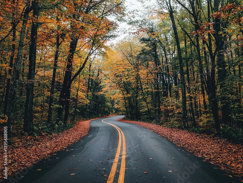 A picturesque road winding through the forest, lined with vibrant autumn foliage