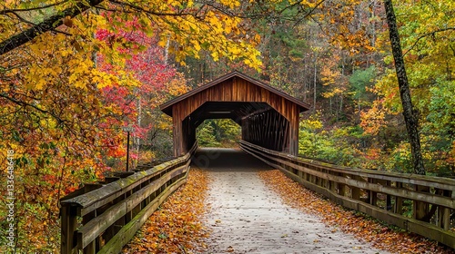 A picturesque scene showcasing a charming covered bridge enveloped by vibrant autumn foliage. The bridge, built from wood, is seen in the center, with a pathway leading towards it, flanked by trees dr
