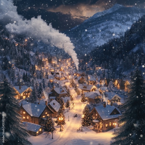 A picturesque snow-covered village nestled in a mountain valley at twilight, illuminated by warm lights, with a plume of smoke rising from a central point, creating a cozy and magical winter scene